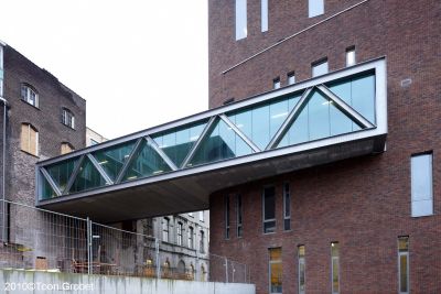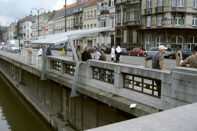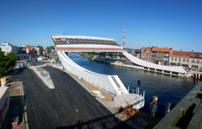 Tekst: <p>L’édifice historique Smedenpoort (Porte des forgerons) fut érigéà Bruges aux treizième et quatorzième siècles. Cette porte d’entrée de la ville était devenue trop étroite pour permettre une circulation fluide des voitures, piétons et cyclistes, particulièrement aux heures de pointe. C’est pourquoi il a été décidé de réaliser deux passerelles piétonnes de part et d’autre du pont-levis existant. Le tracé en plan a été adapté de telle sorte que les nouvelles passerelles enserrent la porte et le pont existants. Les nouvelles passerelles se doivent de respecter le contexte historique fort dans lequel elles s’incrivent.</p><p>La multiplication des supports et l’utilisation structurelle du garde-corps permettent de réduire la dimension de tous les éléments porteurs et d’obtenir ainsi une transparence maximale. La structure combine des poutres de type Warren et Vierendeel. Les deux mains courantes fonctionnent comme poutres principales, qui portent un tablier fait de dalles de béton posé sur des traverses. Les poutres continues sont soutenues tous les 5 m par de fines colonnes de 60 sur 60 mm. Les structures portantes sont en acier auto-patinable.</p>