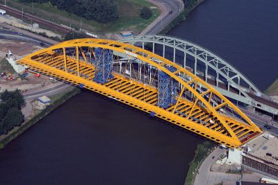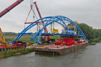 Tekst: <p>Afin de rendre nos voies d’eau intérieures navigables pour de gros porte-conteneurs à quatre niveaux, le gabarit en hauteur et la largeur du Canal Albert doivent être augmentés en de nombreux endroits. C’est notamment le cas à Oelegem, où un nouveau pont en arc ‘générique’ est en place depuis quelque temps.</p><p>La portée du pont d’Oelegem est de 104 m. Il y a deux bandes de circulation avec deux pistes cyclables latérales de 3 mètres. Le squelette du pont est complètement en acier S355 sauf les tirants qui sont des barres pleines en acier de très haute qualité (S520). La protection comprend un système à trois couches avec un DFT de 320 micromètre, tandis que les flasques sont galvanisés.</p><p>La tablier et l’arc furent totalement préfabriqués et acheminés sur ponton. Après assemblage par soudure des différents éléments en acier sur la berge, le squelette complet fut placé sur sa culée et parachevé.</p>