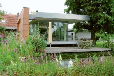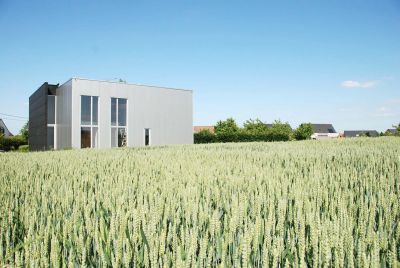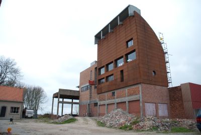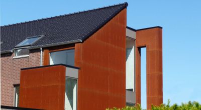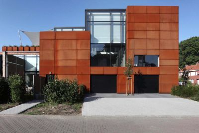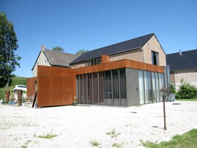 Tekst: <p>Pour rompre avec la volumétrie classique d’une habitation banale, une petite tour a été conçue et placée asymétriquement au rez-de-chaussée.</p><p>Côté ouest, un patio a été aménagé pour que la lumière du soir puisse pénétrer profondément. A l’arrière, le jardin, aménagé avec sobriété et entouré de lamelles, frappe le regard. Ces lamelles doivent conférer un sentiment de sécurité dans le paysage champêtre.</p><p>Pour souligner la verticalité de la maison, des lamelles verticales ont été choisies comme revêtement de façade. Les lamelles et les panneaux perforés sont en acier autopatinable.<br />Pour pouvoir placer l’ensemble de façade rapidement et simplement, des panneaux, qui peuvent atteindre 10 m2, ont été soudés l’un à l’autre au préalable en atelier, et accrochés d’un seul mouvement à la manière d’un portemanteau à la rive de toiture.Les lamelles de jardin sont hautes et donc soumises aux forces du vent. C’est pourquoi leurs bases ont été consolidées, les lamelles exécutées en 3 mm et l’ensemble fixé sur une console galvanisée souterraine. Les deux métaux ont été découplés avec un caoutchouc contre le courant galvanique.</p><p>De cette habitation émane une atmosphère particulière, qui contraste avec l’aspect banal du lotissement flamand.</p>