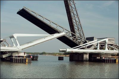 La solution d’un tablier mobile en acier semblait la seule option logique. L’acier a aussi été choisi pour la partie fixe du pont. Les tabliers des deux éléments du pont ont été réalisés au moyen de tôles orthotropes en acier S355 et recouverts d’époxy résistant à l’usure. Les poutres principales de la partie fixe sont des profilés en I, alors que celles de la partie mobile sont soudées en caissons. La partie mobile est équipée de deux triangles debout. L’angle supérieur de chaque triangle est relié à un câble. Le tablier du pont est levé et rabaissé lorsque ces câbles sont enroulés ou déroulés.</p>