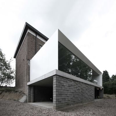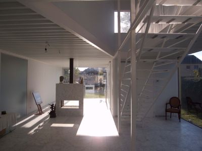 Tekst: <p>Pour l’extension de cette maison individuelle, de nouveaux escaliers ont été dessinés afin de permettre l’accès du rez au premier et au deuxième étage où une passerelle métallique relie l’extension au bâtiment existant. L’escalier est construit avec limons latéraux et supports pour marches en bois. La structure ainsi que le garde-corps sont réalisés en acier laqué, les sols des paliers et de la passerelle (ainsi que son garde-corps) sont en verre. L’acier a été choisi car il permet une construction solide d’épaisseur minimale.</p>