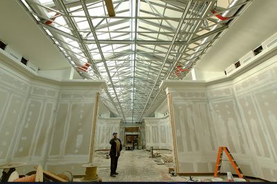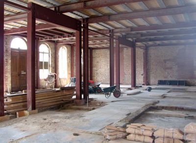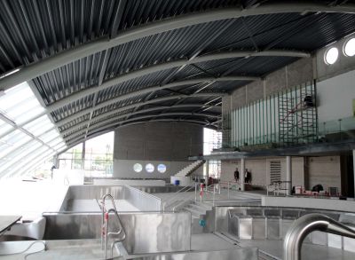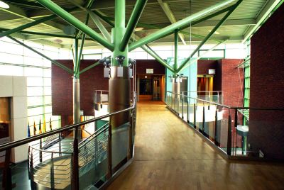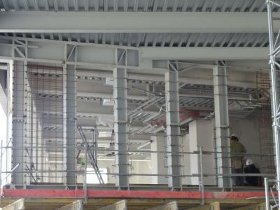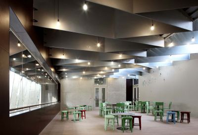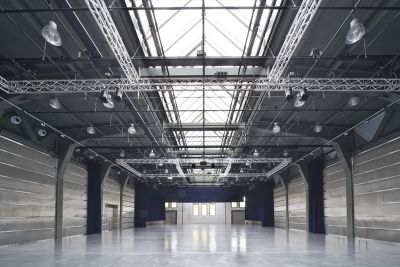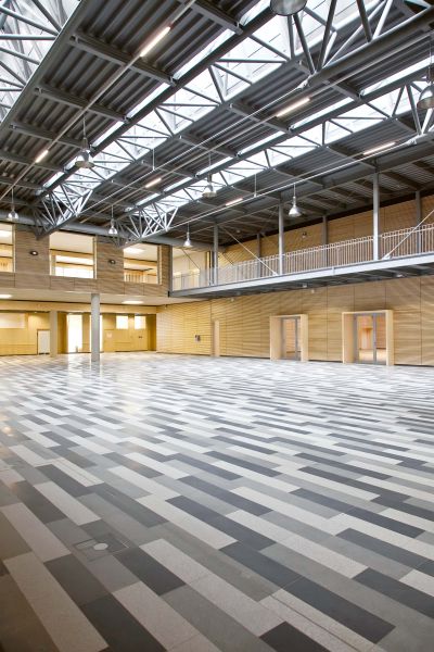 La salle multifonctionnelle peut accueillir jusque 980 personnes. Les structures existantes en béton étant irrégulières d’aspect et inaptes aux nouvelles surcharges, l’idée de l’architecte a été de les envelopper par une structure apparente de renforcement en acier. <br>