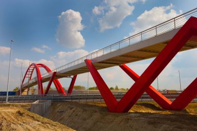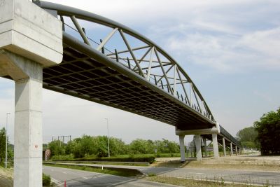 Tekst: <p>Afin de contourner les carrefours dangereux de la Luchthavenlaan à Machelen, on a choisi d’aménager parallèlement à celle-ci une piste cyclable et une passerelle pour cyclistes au-dessus de la E19. Il s’agit d’une passerelle 100 % en acier. Elle est constituée de deux parties : un avant-pont et le pont en arc. L’avant-pont est un pont portique ; le tablier est posé sur des poteaux obliques faisant office de portiques. Le tablier consiste en deux poutres principales creuses encadrant un tablier orthotrope. Les poteaux et les poutres transversales ont également une section creuse. L’avant-pont est équipé d’un système de conservation à trois niveaux. Le pont métallisé en arc est constitué d’un arc de section creuse variable. L’arc se dédouble à l’approche de la naissance de l’arc. Le tablier est placé entre les arcs, son concept est identique à celui de l’avant-pont. </p>