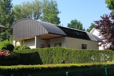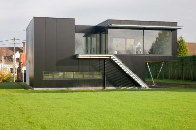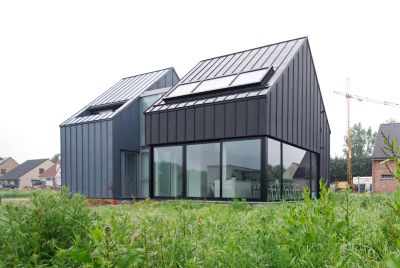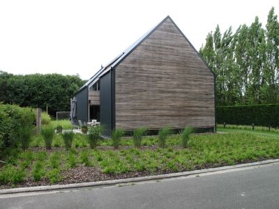 Tekst: <p>Le projet consiste en la construction d’une villa unifamiliale avec le choix d'une ossature métallique.</h1><br><p>L’implantation de la villa répond au contexte local et a la volonté de dégager une grande surface de jardin et de préserver l’intimité de ses occupants. Le volume est plié sur un axe central et couvert d’une toiture végétale à deux versants. </p><p>Les matériaux de façade sont le verre, le bois et le végétal. La maison entièrement couverte d’un bardage en bois, peint en noir. L’ossature métallique est apparue dès le départ comme une évidence au niveau de la logique structurelle du projet, de la rapidité et facilité de mise en œuvre, ainsi que pour son aspect économique.</p>