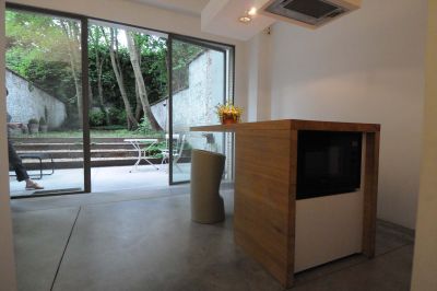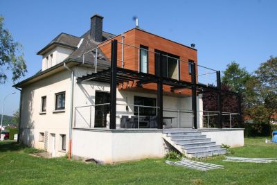 Tekst: <p>La nouvelle terrasse est construite en porte-à-faux, au-dessus de l’entrée de garage. La structure est constituée d’une plateforme en poutres laminées reposant d’un côté sur 2 piliers en acier et fixée de l’autre côté sous la dalle du rez-de-chaussée. Entièrement réalisée en acier galvanisé en raison de sa légèreté et de ses qualités structurelles et anticorrosives, la terrasse est bordée d’un garde-corps en matériel composé ornementé reprenant l’aspect métallique de l’ensemble.</p>