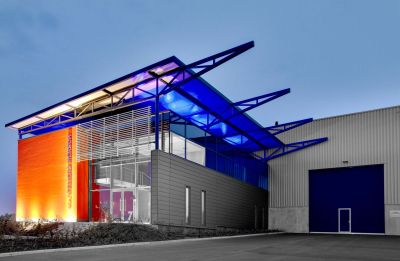 Les façades métalliques du showroom sont combinées avec un mur rideau vitré sur une structure acier. <br>