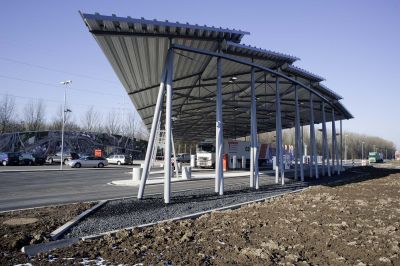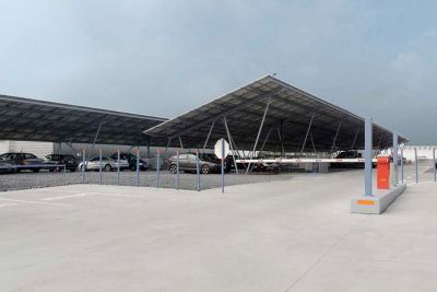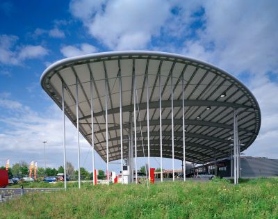 Tekst: <p>Afin de dégager un maximum de surface au sol, l’auvent de Wemperhardt est suspendu à 2 pylônes tridimensionnels reliés par une poutre du même type. La partie centrale est entièrement transparente grâc