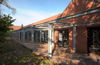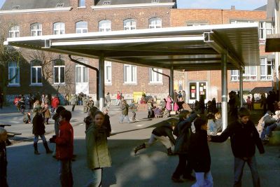 Tekst: <p>Pour ce projet qui comprend une école primaire, une école précoce, une structure d’accueil ainsi qu’un hall des sports, un ensemble d’auvents en acier a été réalisé dans la cour ainsi qu’au dessus de la rampe d’accès à l’école primaire. Ces structures légères et aérées combinent un système de poteaux de section ronde reliés par des traverses de section carrée et une ossature secondaire faite de tubes de section carrée supportant le bac de couverture. Une note de fantaisie est introduite par la disposition aléatoire des poteaux qui se prêtent parfaitement aux jeux d’enfants.</p>