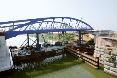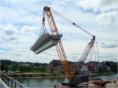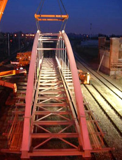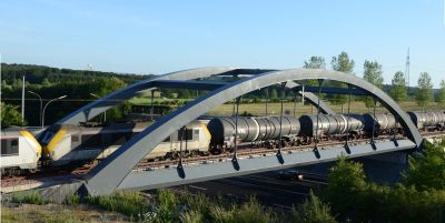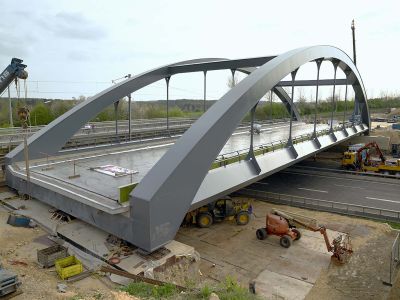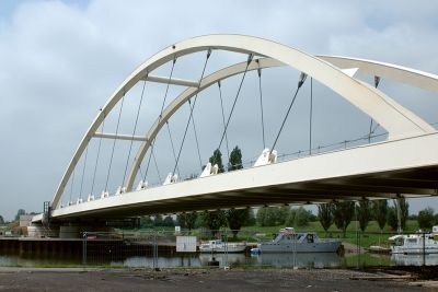 Tekst: <p>Pour la structure portante du nouveau pont de Melle, d’une portée totale de 51 m, le choix s’est porté sur un pont en arc d’une largeur de 8,20 m et d’un poids de 115 tonnes d’acier. Le rayon de courbure de l’arc est de 7,50 m ; l’arc est relié au tablier au moyen de 11 barres rondes. Le pont a été testé suivant les normes EN actuelles aussi bien pour l’état limite ultime que pour l’état limite de service.<br>