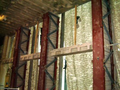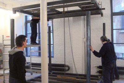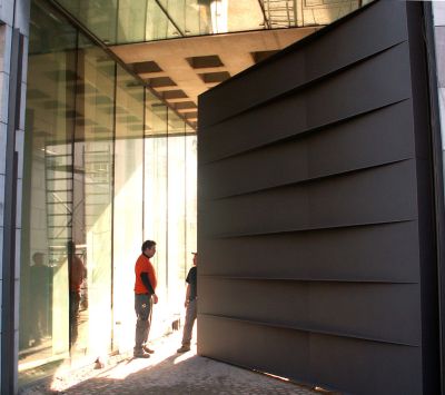 L’élément le plus marquant de l’intervention - le mur - a entièrement été réalisé au moyen de pièces d’échafaudages en acier galvanisé, prêtées pour la durée de la Biennale et ensuite reprises par l’entrepreneur spécialisé. Les panneaux réfléchissants, utilisés comme finition extérieure parfaitement modulée du mur, sont en réalité les passerelles du système original. La réalisation du mur devait se dérouler sur la base de conditions très contraignantes : l’impossibilité de prévoir des fondations et des limitations budgétaires. Les éléments d’échafaudages en acier offraient la seule réponse possible à ce problème.