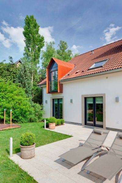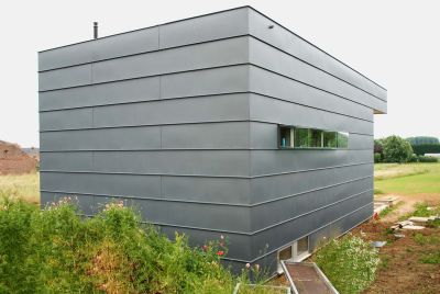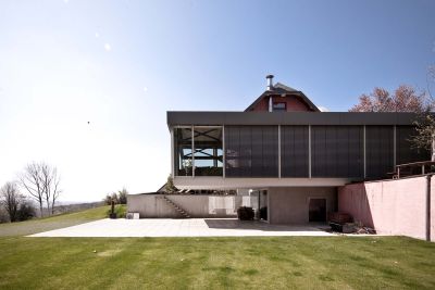 Tekst: <p>La maison, largement vitrée et transparente, acquiert sa robustesse et sa vigueur grâce à l’enveloppe d’acier auto-patinable de 2 mm d’épaisseur qui la protège comme la carapace de certains animaux. Elle est ainsi posée fermement dans la partie montante du vignoble, à l’une des extrémités d'un village des plus connus de la région viticole de la Moselle, haut-lieu du Riesling luxembourgeois.</p>