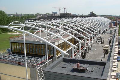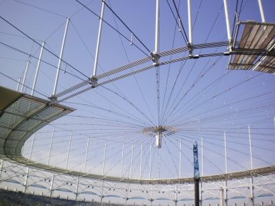 Tekst: <p>La construction a exigé de relever plusieurs défis structurels et d’ingénierie : une augmentation de la capacité de 22 500 à plus de 30 000 spectateurs, la construction d’un nouveau bâtiment principal et d’accueil du côté ouest du stade et surtout la construction d’un tout nouveau toit en acier, câbles et Makidon.<br>La toiture circulaire située à plus de 40 m de hauteur est le principal pôle d’attraction du nouveau stade. Avec un diamètre de 217 m, le toit dépasse de loin les places assises. De cette façon, même les spectateurs aux premier et dernier rangs sont suffisamment protégés contre la pluie et le soleil.<br>La toiture en câbles d’acier d’une spectaculaire légèreté est l’élément phare du projet d’extension du stade BayArena. La structure porteuse, basée sur le principe d’une roue à rayons, présente la particularité d’avoir les câbles d’acier raccordés de manière croisée non pas au moyeu mais à la jante externe formée de tubes d’acier.