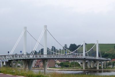Tekst: <p>Le pont ‘De Oversteek’ relie Nimègue-Ouest au nouveau quartier De Waalsprong, une extension de la ville sur la rive nord. Il comprend quatre bandes de circulation et une bande d’arrêt d’urgence. Du côté de la ville, une piste de quatre mètres de large a été créée pour les cyclistes et les piétons.</p><p>La longueur totale du pont est de 1.195m, rampes comprises. La construction en acier de 285 mètres pour la travée principale est le plus grand pont à un seul arc d’Europe. Grâce à cette construction ce n’est pas seulement le chenal de navigation, mais tout le fleuve qui est franchi.</p><p>La construction en arc rappelle le style de l’ancien pont sur le Waal. La maçonnerie traditionnelle avec des briques sur les côtés des travées d’accès se éfère à Nimègue en tant que ville et donne au pont un caractère urbain. En utilisant les forces transmises par l’arc, on peut construire un pont avec un minimum d’acier. En raison de la minceur du pont, de son esthétique et des exigences de la sécurité incendie, c’est un acier de grande qualité qui a été choisi. </p>