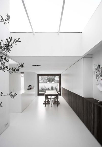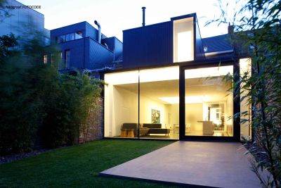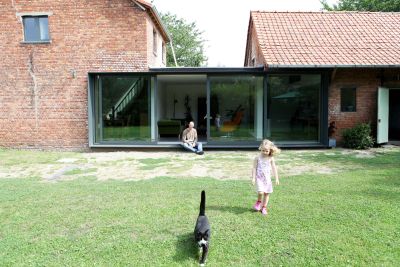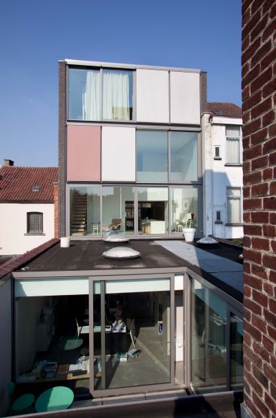Tekst: <p>Un entrepôt de 245m² utilisé par une entreprise de restauration en périphérie de l’ancien centre de Bruges, était au fil des ans encerclé par des immeubles résidentiels.</p><p>L’architecte a opté pour une nouvelle construction de remplacement (atelier avec habitation) ressemblant beaucoup au bâtiment d’origine. Le volume parallélépipédique de 33 x 5 m est logé entre des murs mitoyens, avec un espace restant utilisé comme un jardin. Douze portiques identiques présentant un entre-axe de 3 m apportent un certain rythme aux onze travées dans la distribution de l’espace. Le projet a été réalisé en deux phases, les portiques de la partie habitation sont laqués en noir, tandis que ceux de la partie professionnelle ont été métallisé en noir. Comme seuls les portiques font office d’éléments porteurs, l’architecte dispose d’une totale souplesse fonctionnelle.</p><p>Le but n’est pas de se positionner comme un monument, mais bien de témoigner du passé de manière subtile.</p>