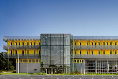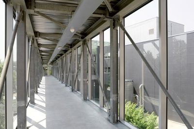 <p>Le bâtiment originel, en structure béton armé, est réalisé selon une trame régulière de 4,80 x 4,80 m et est calepiné dans l’ensemble de ses éléments constructifs. Le nouveau bâtiment est une déclinaison métallique des principes constructifs de base. L’intégralité de la structure est réalisée en acier. Les verrières sont en structures mixtes bois-acier et les passerelles en structures mixtes verre-acier.