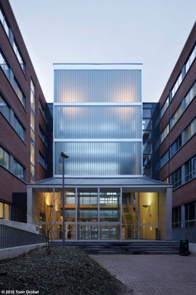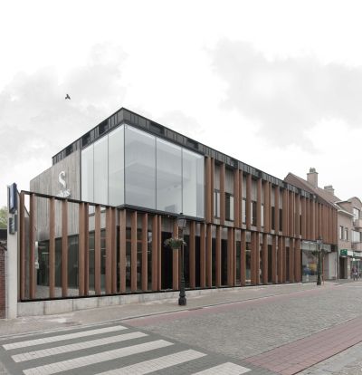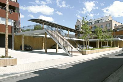 Tekst: <p>L’immeuble de bureaux passifs et les auvents en acier et en verre de la place communale de Mortsel font partie d’un plan directeur qui a profondément modifié l’apparence et l’utilisation de cet espace public. L’administration communale écologique de l’époque avait confié la tâche de donner une identité à cet espace fragmenté – davantage espace de stationnement que place publique.</p><p>Le terrain à bâtir se trouve sur l’un des deux axes de circulation : c’est aussi à cet endroit que doit venir l’accès au parking souterrain et le départ d’une piste cyclable en déblai (qui traverse en souterrain la chaussée de Lier). Ces données constituent la base du projet fourni par les Architectes Abscis : pour marquer l’axe de circulation, le bâtiment l’a littéralement recouvert. Un projet peu courant, qui est abordé comme la construction d’un grand pont. Surtout que la partie en porte-à-faux est plus grande que la partie posée.</p><br /><h3>Des auvents en forme de papillons de verre</h3><br /><p>Pour la structure portante de l’auvent, on a utilisé l’acier. Les Architectes Abscis : ‘Les colonnes en acier galvanisé constituent une structure d’arbre avec des branches qui soutiennent les plaques de verre.’</p>