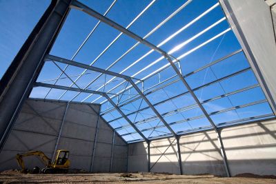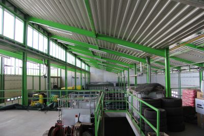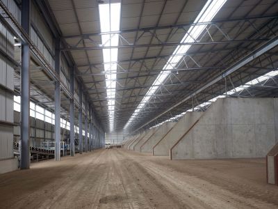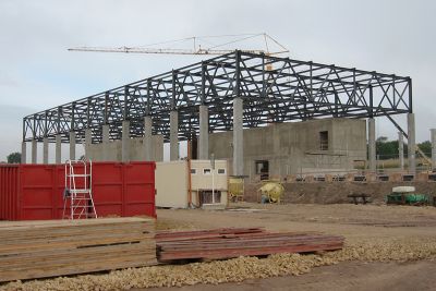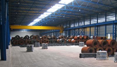 La structure en acier du hall de stockage se compose de portiques en profilés laminés type HEA 550 et IPE 600, l’espace dégagé est de 128 x 23 m au sol sur une hauteur de 14 m. <br>