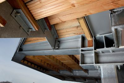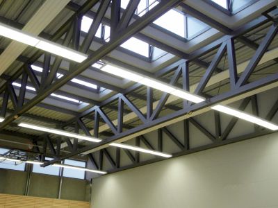 La charpente est un système de poutres sous-tendues constitué de 2 poutrelles IPE 600, de poinçons réalisés en tubes rectangulaires 200 x 100 mm et de 2 tirants en plats de 100 x 30 mm disposés de part et d’autre des faces des poinçons. Ces poutres sont en appui simple sur les poteaux. La stabilité est assurée par un contreventement en toiture repris sur des voiles ainsi que des palées verticales réalisées en rond plein de diamètre 36 mm. La combinaison d’une structure poutre dédoublée avec sous-tension a permis de créer une structure aérée.<br>
