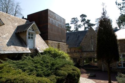 Tekst: <p>Une forme, une masse ..une tour, un donjon!.. ce projet se devait de conserver la force du concept initial et ne souffrir d’aucun artifice architectonique, ni d’empilement démonstratif technique. C’est la raison pour laquelle l’architecte a opté pour une utilisation radicale d’acier autopatinable. Ce sujet était l’occasion d’expérimenter une autre conception de l’acte de construire : une coque étanche en acier auto-patinable structurant, fabriquée en atelier pour se substituer à la toiture de la chapelle. Le cube d’environ 6 m d’arrête vient ainsi doubler le volume existant en hauteur dégageant trois niveaux. Laminé à chaud, l’acier noir se transforme lentement chaque jour, prenant sa teinte rouille en accord avec la pierre meulière dont est constitué le socle. Ce bloc est-il plein ou vide? L’architecture ne laisse rien transparaître de sa technicité, de son programme, en fuyant tout maniérisme ... et cela grâce à l’acier !