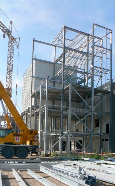 Les constructions en acier répondent à une organisation à la pointe du progrès, largement automatisée et évolutive. La surface bâtie de 33.000 m2 est couverte par des charpentes en treillis. Ces structures en acier S235 et S355 reposent principalement sur des colonnes monolithes ou des poutrelles HEB 220. Côté accès, le complexe se signale par un hall proéminent à ossature métallique. <br>