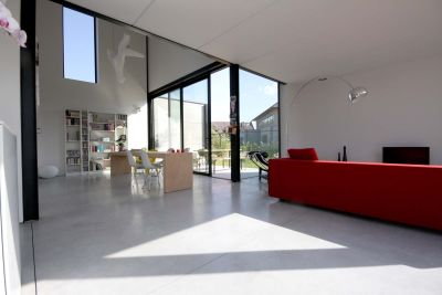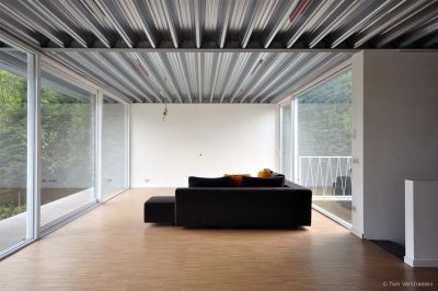 Tekst: <p>L’intérieur de la maison passive à Sint-Pieters-Leeuw est construit autour d’une séquence en spirale d’espaces qui constituent un paysage interne. La promenade passe à travers des zones plus ouvertes vers des endroits plus intimes offrant ainsi chaque fois de variantes relations, entre elles-mêmes et avec le paysage environnant.</p><p>La structure portante au-dessus du sol a été exécutée en profilés d’acier galvanisé visibles. Ces portiques portent les étages supérieurs suspendus, ce qui donne une grande liberté de conception au niveau de vie. Le squelette en acier a été totalement détaché de la peau. Les panneaux en sandwich de la construction industrielle font office d’isolation. Ils assurent un montage facile et rapide, malgré leur épaisseur de 20 cm.</p><p>Le concept osé sur le plan structurel et les techniques de construction industrielle n’empêchent pas qu’un espace intérieur tactile a pu voir le jour grâce aux matériaux naturels.</p>
