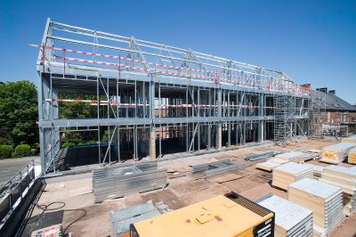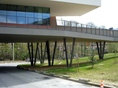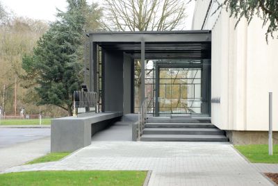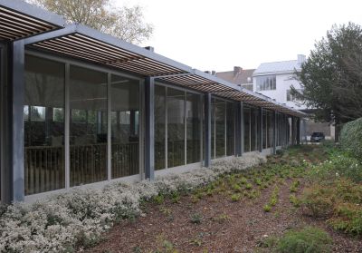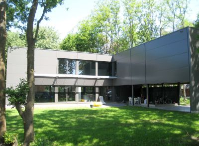 Tekst: <p>L’extension de la villa protégée Ter Beuken est un pavillon des arts dans lequel l’académie de musique, de la parole et de l’image sont rassemblées.</p><p>La passerelle, une construction légère en acier et en dalles de verre entre la villa et l’extension, relie le rez-de-chaussée surélevé de l’ancien bâtiment avec les deux étages neufs.</p><p>Dans la composition de la façade, la structure portante joue un rôle important. Les colonnes en Y élancées, très présentes sur le périmètre du volume de construction, font indissolublement partie de la structure portante.La structure minimale de la dalle de plancher et de la dalle-toiture sur des colonnes permet un contact optimal avec le parc boisé. Les colonnes tordent la corniche en acier, qui est composée de profilés en caisson. Des pièces d’accouplement spécialement conçues assurent la liaison avec les profils en acier qui se trouvent à l’intérieur de l’enveloppe isolée. L’interruption thermique nécessaire est garantie.</p>