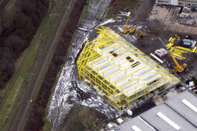 La construction d’un nouveau hall pour le stoc-kage et le transbordement des pellets de bois destinés à Rodenhuize 4 était nécessaire. Ce bâti-ment, d’une longueur de 655 m et d’une largeur de 50 m, a été divisé en quatre compartiments devant pouvoir rester autonomes en cas d’incen-die. Une zone de sécurité équipée d’un rideau d’eau est prévue entre ces compartiments. Cela a permis de construire le hall sans cloisons intermé-diaires, ce qui constitu un grand avantage pour ce type d'activités.</p>