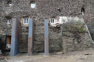 La décision prise fut de stabiliser d’urgence l’ensemble à l’aide d’une structure métallique placée dans le lit de la rivière. Le support métallique devait pouvoir reprendre le poids total du tablier et des voûtes en pierres naturelles durant le remplacement de la pile centrale. Puisque les éléments avaient seulement une fonction de stabilisation en phase chantier, la simplicité de mise en œuvre et leur coût étaient les seules contraintes.<br>