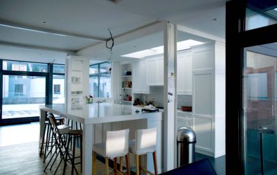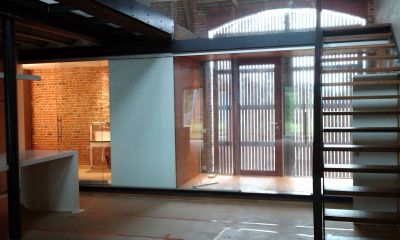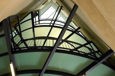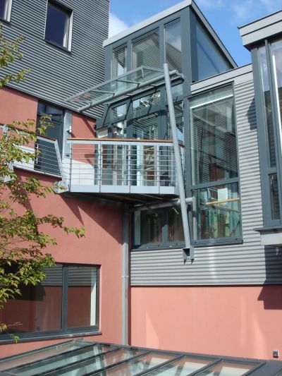 Tekst: <p>Classés Monument national par l’état, les bâtiments de l’ancienne clinique ont été réhabilités en 12 appartements aux étages et en commerces au rez-de-chaussée. L’ancienne cour centrale désormais affectée aux circulations a été couverte d’une verrière. Elle sert d’espace commun sur toute la hauteur de l’immeuble. Les paliers donnant accès aux différents logements associent le métal et le verre. De forme ovale, ils sont détachés des 4 murs de la façade intérieure et incorporent la structure de l’ascenseur sur laquelle ils prennent appui.</p>