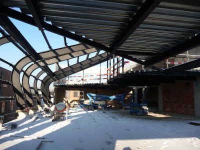 Tekst: <p>Le complexe du nouveau campus à Bruges est recouvert d’une toiture en acier monumentale qui se transforme, le long de la voie rapide, en façade avec bardage en zinc de couleur anthracite. La structure du toit est en acier afin de pouvoir franchir de grandes portées au moyen d’une construction légère. Les fermes en acier - structure en treillis - sont portées par des colonnes en béton assurant la stabilité nécessaire. La structure en acier dans son ensemble mesure 169 m de long, 50 m de large, 24 m de haut et pèse 598 tonnes. Dans la grande cage d’escalier, les poutrelles de toiture et les colonnes font office d’arêtiers, accentuant ainsi la finesse et l’ouverture de ce campus. Cette sensation d’ouverture se retrouve dans la cafétéria, où des arêtiers sont aussi utilisés. Tout le long de l’arrière du bâtiment se trouve un auvent élancé.</p>