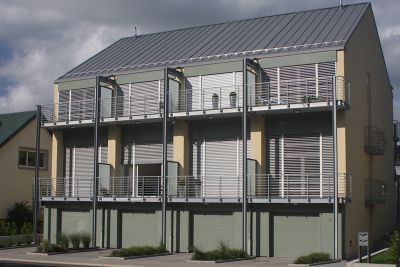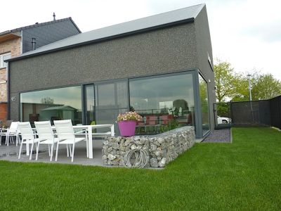 Tekst: <p>Cette maison, située dans le canton de Grevenmacher, s’ouvre avec son pignon vitré vers une grande terrasse et un accueillant jardin, situés parallèlement à la rue. Le maître d’ouvrage souhaitait une solution ‘douce’ comme paravent, c’est-à-dire une solution qui permettrait de conserver l’intimité privée entre la terrasse et la rue, mais sans donner l’aspect d’un mur séparatif austère et froid.<br>Le bureau d’architecture WeB a donc eu l’idée de réaliser un rideau en lamelles verticales avec une simple structure en acier, composée de 126 profilés en L (100 x 50 x 6 mm), laqués en couleur DB 703, d’une hauteur de 3 m. Sur une longueur d’environ 9,5 m, six éléments identiques et une double porte forment le paravent. Les six éléments sont miroités et tournés, ce qui donne un aspect et une forme légèrement ondulée. L’idée d’un rideau en acier est renforcée par les interstices variés qui laissent filtrer les rayons de soleil sur la terrasse. Les jeux d’ombre et de lumière donnent alors l’impression d’un voile flottant.</p>