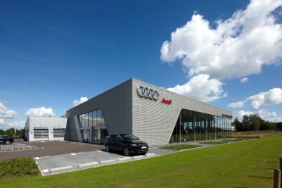 Tekst: <p>Le garage est un point de vente officiel pour voitures Audi. Le bâtiment doit dès lors correspondre aux critères précis du constructeur automobile qui impose un certain nombre de détails et de finitions. <br>