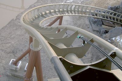 L’utilisation d’un ‘bac à gravier’ permet aux rails de passer en courbe sur le pont droit.</p>