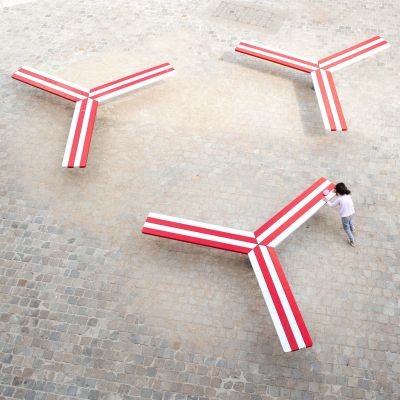 Le souci d’intégration au contexte a plaidé en faveur d’une structure minimale et légère. Quatre poteaux métalliques tubulaires de teinte jaune, rouge, bleu et vert supportent une membrane tendue translucide. Des tirants en inox assurent également la reprise des charges tandis que les blocs dans lesquels ils sont ancrés ont été aménagés en bancs.</p>