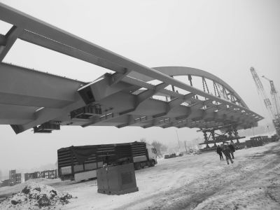 Les culées et les porteurs transversaux aux extrémités sont perpendiculaires à l’axe longitudinal. La section des poutres principales et des arcs est en caisson. Le pont possède un tablier orthotrope avec support transversal tous les 750 mm, de poutre principale à poutre principale.<br>
