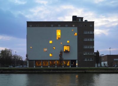 Tekst: <p>Faire d’un silo de farine un espace de bureaux, telle était la mission de ce bureau d’architectes. L’acier devait jouer un rôle majeur en raison de sa flexibilité et de sa durabilité. Il a été utilisé comme structure d’appui pour les planchers, comme structure temporaire - à réutiliser à chaque niveau - de démontage pour les parois en béton à découper et de montage pour les planchers en hourdis. Tous les nouveaux éléments ont aussi été réalisés en acier, comme les escaliers (suspendus au niveau supérieur) et la loggia caractéristique du côté du canal. Afin de rendre possible l’affectation en bureaux, il a été nécessaire de percer un grand nombre d’ouvertures dans les parois existantes sans compromettre la stabilité du bâtiment, ou influencer négativement le comportement à la déformation. Pour la mise en place des hourdis, des profilés de coin en acier ancrés ont été utilisés.