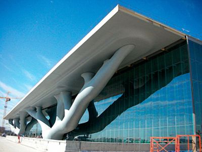 La charpente métallique a permis, par des moyens simples, de réaliser la forme en aile d’avion de la toiture, tout en créant un espace technique. La structure de la toiture est un grillage de poutres en treillis de 100,8 x 108 m. Des chevêtres au nombre de 49 sont réalisés pour servir d’appui aux coupoles d’éclairage. Les façades se caractérisent par une structure d’échelles en acier très mince, habillées par un vitrage ultra performant. Les montants et les traverses sont réalisés par découpage de plats d’acier, assemblés en profilés T par soudage invisible. Les échelles, sont reliées par des traverses et des éléments de jonction spéciaux, boulonnés. Ces assemblages sont partiellement mobiles et fixes afin de reprendre les tolérances constructives, la dilatation et les déformations dues au vent.</p>