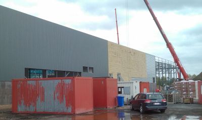 Les aciers employés sont de nuance S355. Les couvertures et les bardages des halls sont réalisés en panneaux métalliques double peau à isolation intégrée.</p>