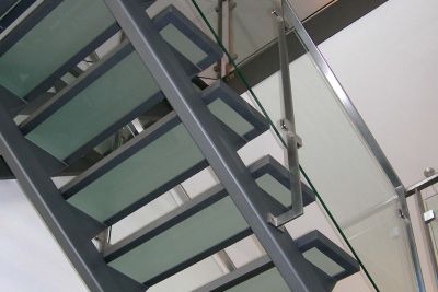 Tekst: <p>Dans cette nouvelle habitation, les escaliers qui relient les trois niveaux (0, +1, +2) comprennent un limon central et des caissons pour recevoir les marches et palier en verre (30 mm d’épaisseur). La structure de l’escalier est en acier. Le garde-corps est en inox et les panneaux de remplissage en verre. L’acier a été privilégié en raison de ses qualités de solidité et de légèreté. Il a été laqué afin de s’intégrer au style moderne de cette maison où dominent l’inox et le verre.</p>