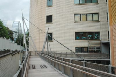 La poutre principale de ce pont suspendu est un caisson métallique d’une largeur constante de 3,2 m et d’une hauteur de 1 m. L’épaisseur de la tôle d’acier du caisson varie entre 8 et 30 mm. Les raidisseurs transversaux tous les 2 m assurent une bonne liaison entre les tôles. Les raidisseurs sont visibles sur la face inférieure et contribuent à la légèreté de l’ouvrage. Un câble fermé de 90 mm de diamètre suspend la structure à deux mâts articulés de section variable. Pour la réalisation de cette passerelle, 250 tonnes d’acier de qualité S355 J2G3 ont été nécessaires.</p>