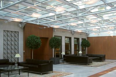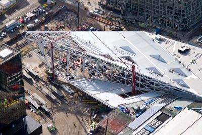 La fonction de la coupole en acier est à la fois esthétique et opérationnelle. Elle assure d’une part un apport de lumière suffisant, et doit d’autre part être démontable pour la mise en place ou l’enlèvement de l’escalator ou d’autres appareillages de grande taille. Exigence supplémentaire, la coupole devait être à même de résister aux efforts accidentels. Afin de satisfaire ces deux exigences contradictoires, la solution en acier a été choisie, celle-ci étant à la fois légère et résistante.</p>