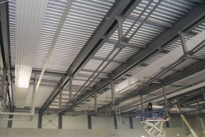 La toiture est composée de panneaux sandwich autoportants, en tôle d’acier, à isolation thermique en laine de roche, et avec une tôle perforée en face inférieure, dans le but d’améliorer l’ambiance acoustique dans l’atelier.</p>