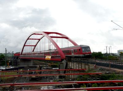 Tekst: <p>Le pont ferroviaire de 1925 à hauteur du Galluspark de Francfort devait être remplacé, impliquant aussi une adaptation de son implantation et de sa portée.<br>