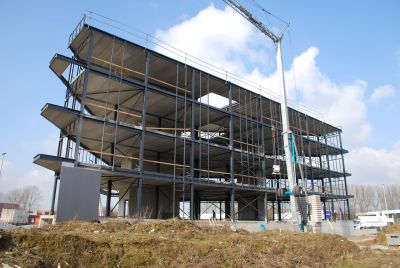Tekst: <p>Ce bâtiment de bureaux de 8 500 m² est destinéà l’extension des bureaux d’études de CMI Cockerill Maintenance & Ingénierie, logés actuellement dans le château de Seraing.</p><p>La structure est presque exclusivement constituée de poutres et de colonnes métalliques avec planchers en hourdis en béton précontraint et noyaux rigides en béton armé et post contraint.</p><p>L’ouvrage présente un important porte-à-faux dont la superficie totale de près de 2 000 m² est réparti sur trois niveaux. Il est composé de quatre poutres treillis de 25 à 35 m de portée s’appuyant l’une sur l’autre et dont la principale s’encastre dans un imposant voile-console en béton post contraint reposant directement sur le lit rocheux à dix mètres de profondeur. 350 tonnes d’acier S355 et S460 ont été nécessaires pour la construction de l’ouvrage, dont 150 tonnes pour les seules quatre poutres treillis du porte-à-faux. Ces dernières ont été réalisées entièrement en atelier, acheminées via la Meuse toute proche et montées sur chantier en quelques jours.</p>