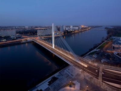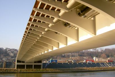 Tekst: <p>La passerelle du Pont de Bezons s’inscrit dans la résolution des problèmes de circulation de la ville. Le prolongement de la ligne de tramway T2 depuis le centre vers les faubourgs demandait l’utilisation complète d’un pont existant sur la Seine. <br>En conséquence, la circulation piétonne et cycliste a été reportée sur deux nouvelles passerelles métalliques ajoutées latéralement à l’ouvrage existant. Préfabriquées , les structures métalliques qui reprennent l’esthétique en arcs du pont, ont été déplacées par barges et mise en place par une grue mobile depuis le ponton.
