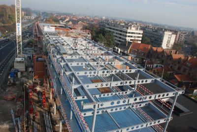 Tekst: <p>‘La Grande poste’ a été inaugurée en décembre 2012. Le chef-d’œuvre de l’architecte Gaston Eysselinck (1907-1953) a reçu une deuxième destination: en effet, le bâtiment des Postes, Télégrammes et Téléphones est devenu un centre culturel.</p><p>Entre la partie rénovée d’Eysselinck et le nouveau bâtiment, les passerelles en acier représentent un complément brillant. Les architecten ont opté pour une construction transparente.</p><p>Le principe des passerelles réside dans la densification d’un treillis avec de fins tirants et des profils plus épais pour absorber les efforts de compression. Des diagonales se croisent mutuellement mais ne sont pas reliées.</p><p>La première et la deuxième passerelle en acier et verre sont supportées par une colonne disposée obliquement et fixées de l’autre côtéà la nouvelle construction.</p><p>La pose a été une entreprise ingénieuse. Les passerelles ont été soulevées depuis la rue au-dessus du bâtiment sur la totalité de leur longueur et placées sur la cour intérieure.</p>