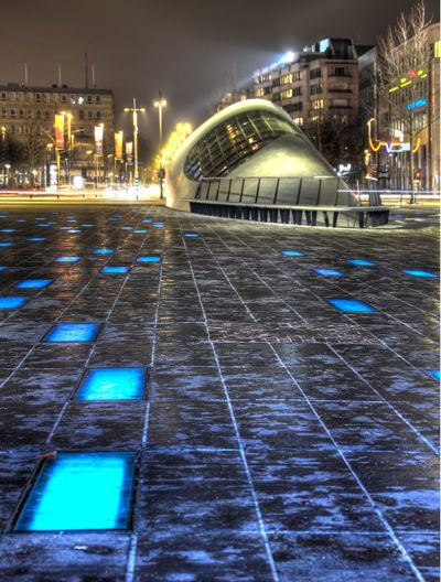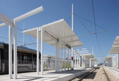 Tekst: <p>L’auvent pour l’arrêt des trams de la Place Flagey s’inscrit dans le réaménagement de l’ensemble de la place. La structure en acier de l’auvent supporte une couverture en verre protégeant les voies et les quais sur près de 900 m². Réalisées dans les deux mêmes matériaux, les entrées des parkings situés sous la place participent également à la cohérence de l’ensemble. La structure en acier de l’auvent, qui permet la traversée de deux voies de trams, se décline en trois rangées de 9 colonnes dont la silhouette évoque celle des arbres qui bordent les étangs d’Ixelles. La structure des colonnes s’affine ensuite pour donner naissance à des structures plus minces encore qui supportent directement le vitrage. </p><p>La structure en acier du large auvent transparent évoque avec légèreté la silhouette des arbres qui bordent les étangs voisins. Sa conception efficace et sa présence élégante permettent de requalifier le réaménagement urbain de l’ensemble de la place publique.</p>