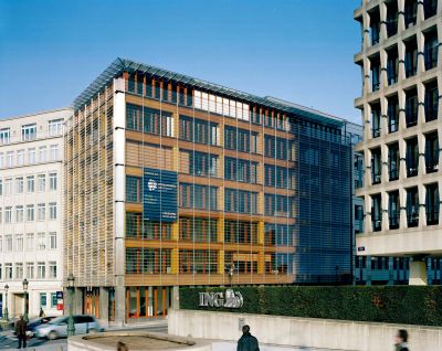 Tekst: <p>L’immeuble sur pilotis surplombe le paysage vallonné typique du Brabant wallon. En-dessous, le stationnement est dissimulé pour préserver les vues vers le parc planté d’herbes sauvages et de chênes épars.</p><p>Les 2 plateaux de bureaux s’organisent autour de patios pour favoriser l’apport de lumière naturelle et la qualité des vues.</p><p>De nombreux éléments sont réalisés en acier : la structure de la couverture de la galerie en poutres tridimensionnelles supportant des bacs acier perforés pour garantir une bonne acoustique, le grand escalier du hall réalisé en 2 parties longitudinales préfabriquées et dont les appuis sont ramenés sur les colonnes des fondations par des grands poteaux obliques supportant des chapiteaux en profils reconstitués, les façades en acier inoxydable supportant les vantelles orientables, leurs mécanismes et leur caillebotis d’entretien.</p><p>Les 8 escaliers de secours escamotables sont réalisés en acier S690 permettant de réduire les sections d’acier pour leur apporter la légèreté et la transparence qui les rend si discrets sur les façades.</p>