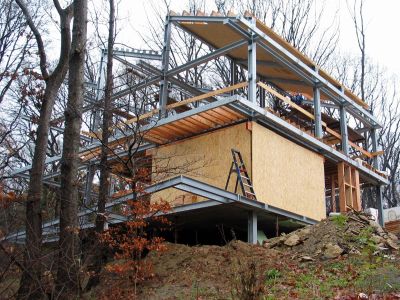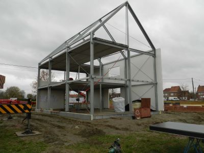 Tekst: <p>Deux frères, tous deux architectes ont bâti chacun leur habitation familiale, sur une grande parcelle qu'ils ont divisée. Chacun y a été de son projet avec une option commune pour l'ossature métallique et pour une architecture contemporaine.</p><p>La colonne vertébrale de la maison d’Arnaud est constituée par une poutre treillis de 8,5 m de long, formée de profilés minces en acier à froid. Noyée dans le plancher mixte acier-béton , elle rigidifie l'ensemble de la structure. La façade extérieur consiste en un panneau sandwich noir micro ondulé de 12 cm.</p><p>Le système constructif primaire de la maison de Johan est une ossature métallique formée de profils minces . Les avantages d’un tel système sont d’isoler les éléments porteurs par la projection de polyuréthane expansé (15 cm) et de diminuer le poids global du bâtiment. À l’étage, le couvrant rez a été conçu avec une dalle mixte acier-béton d’une épaisseur de 24 cm L'enveloppe combine un bardage en cassettes pour le car-port et le volume du séjour et des lames pour les autres parties. </p>
