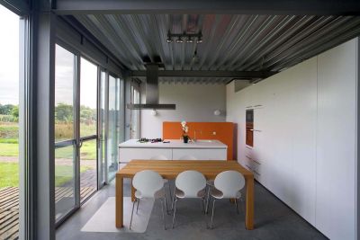 Tekst: <p>Depuis 2004, Egide Meertens a son bureau dans un bâtiment indépendant, situé derrière la maison de ses parents. Très vite, toutefois, ce bureau est devenu trop exigu et l’architecte a décidé de l’agrandir. Au-dessus du volume existant, une pièce de charpente revêtue de panneaux en béton, il a conçu un volume contrasté en zinc prépatiné qui repose par-dessus sous la forme d’une boîte détachée. Pour la structure, Meertens a opté pour le nouveau système de construction en acier de EUROSTEEL framing, placé par Thijs Industriebouw.</p><p>Le nouveau volume s’articule sur le volume existant avec un porte-à-faux de plusieurs mètres. L’arrière est complètement occupé par un grand vitrage qui offre une vue magnifique sur le paysage hesbignon sous-jacent. On obtient ainsi une directivité sur le paysage.</p>